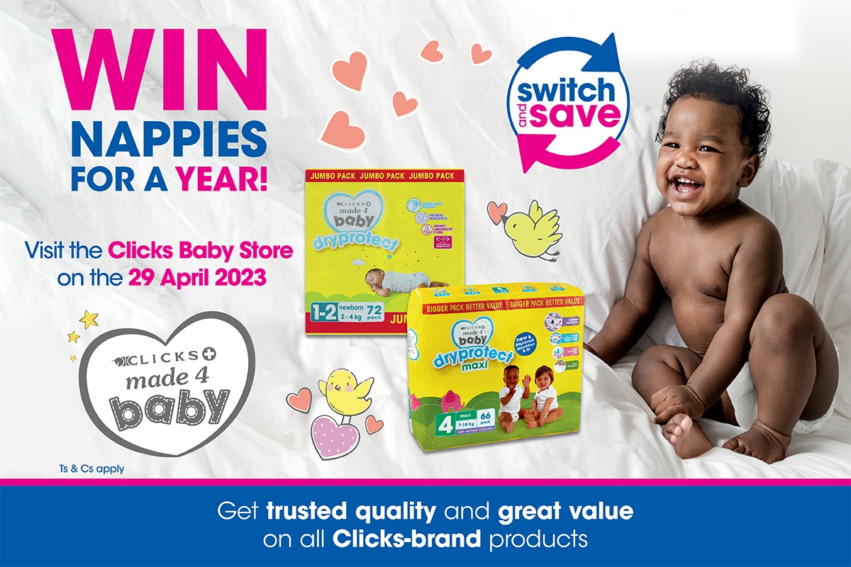 Stand a chance to WIN a year's supply of Made4Baby nappies. To enter: Spend R200 or more at the Made 4 Baby stand at the Clicks Baby Stores and swipe your Clicks ClubCard during the purchase.