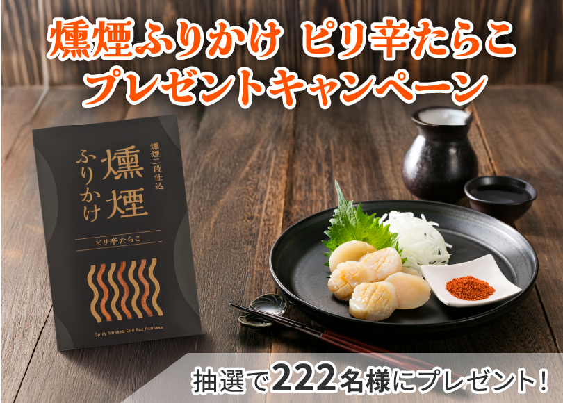 今回のキャンペーンでは、応募いただいた方から抽選で222名様に「燻煙ふりかけ ピリ辛たらこ 28g」をプレゼントいたします。ぜひ、ちょっぴりオトナな雰囲気の燻煙ふりかけをお楽しみください。