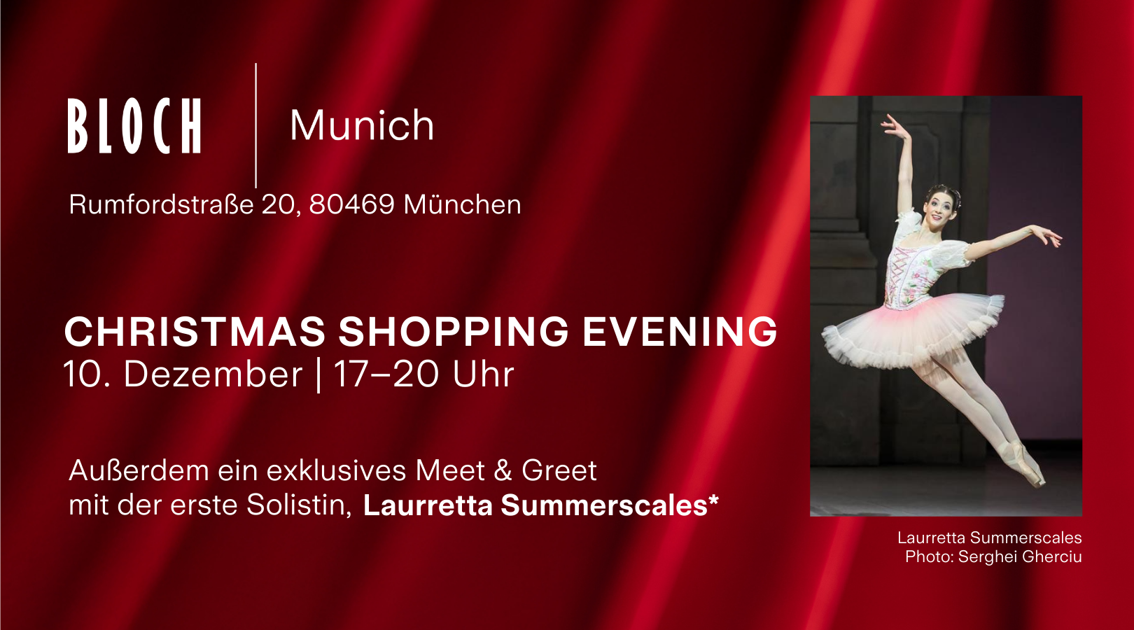 Genieße einen festlichen Abend im Bloch Store München – mit exklusiven Gewinnspielen, liebevoll ausgewählten Überraschungen und einem besonderen einem persönlichen Meet & Greet mit der ersten Solistin des Bayerischen Staatsballetts, Lauretta Summerscales*.