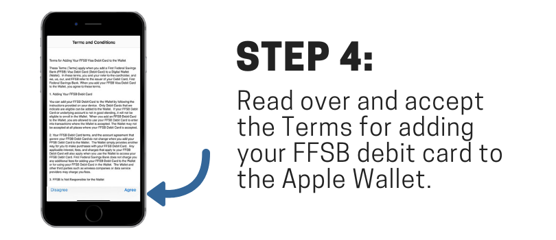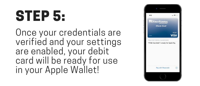 The Apple Wallet® is a service and application designed for iPhone® users. The digital wallet allows you to keep your credit, debit, and prepaid cards, store cards, boarding passes, movie tickets, coupons, rewards cards, and more in one place. First Federal Savings Bank debit cards are compatible with Apple Wallet and Apple Pay®, so below you will find a step-by-step guide on how to add your debit card to your digital wallet. After your information is verified, your card will be authorized to use with Apple Pay.