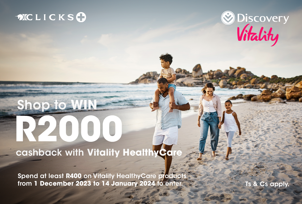 Stand a chance to Win R2000 in Cashback Rewards. To enter: you must have activated Vitality HealthyCare and purchased Vitality HealthyCare products to the value of R400 in a single transaction at a Clicks store in the Republic of South Africa and swipe your Clicks ClubCard during the purchase.