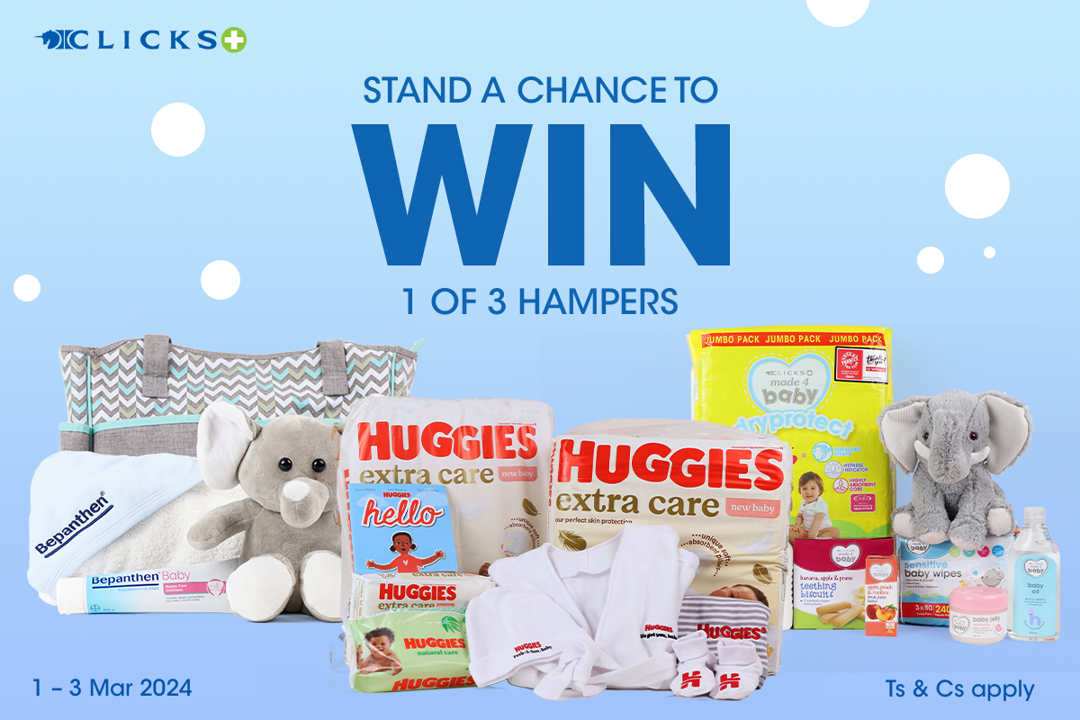 Stand a chance to WIN 1 of 3 hampers. To enter, purchase for R600 or more at a Clicks Baby store between 1 – 3 March 2024 and receive a goodie bag.