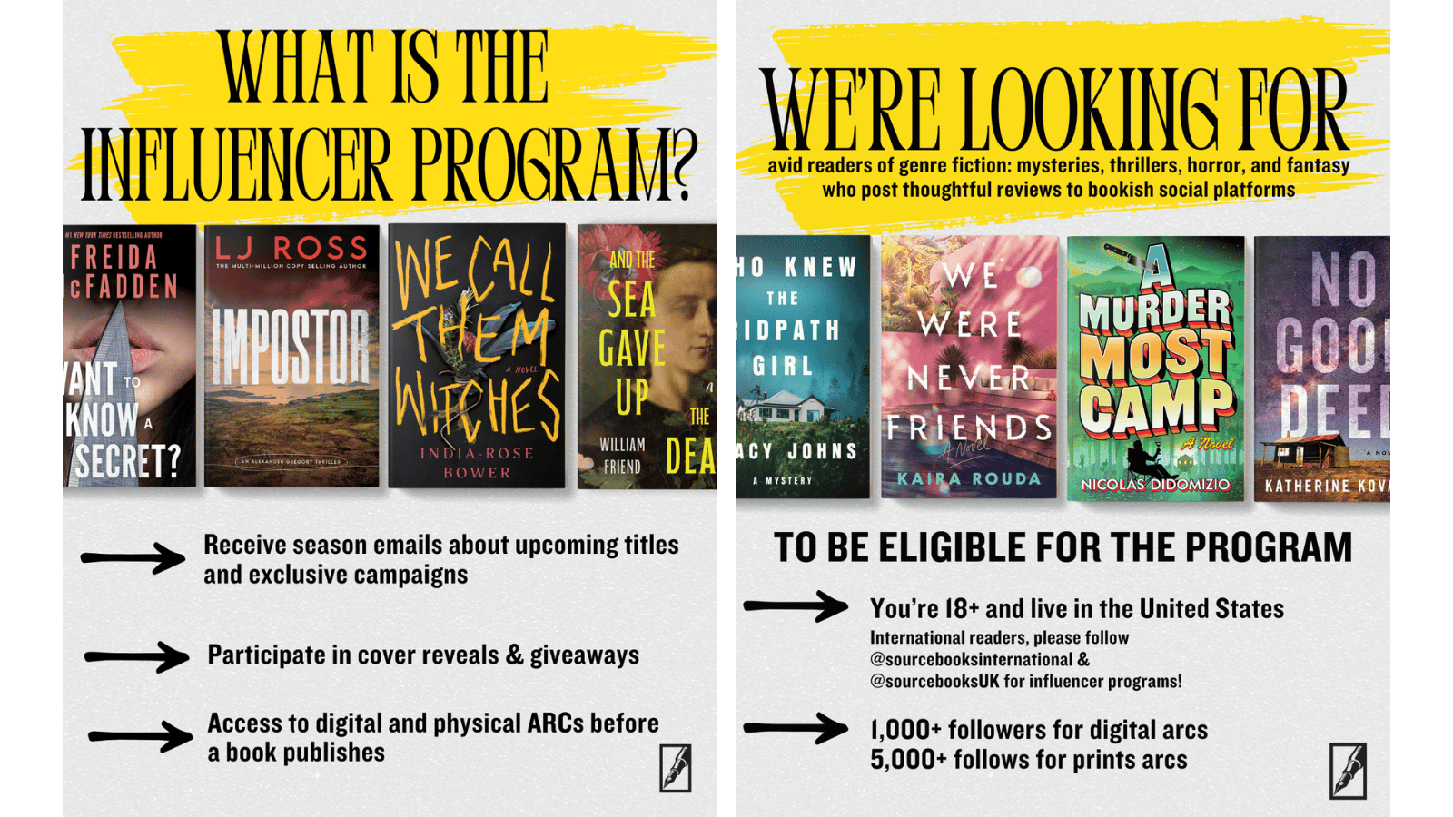 Yes. All influencers, including those accepted into another Sourcebooks influencer program, must apply. This helps ensure we maintain a fresh and diverse group of influencers who best represent Poisoned Pen Press.