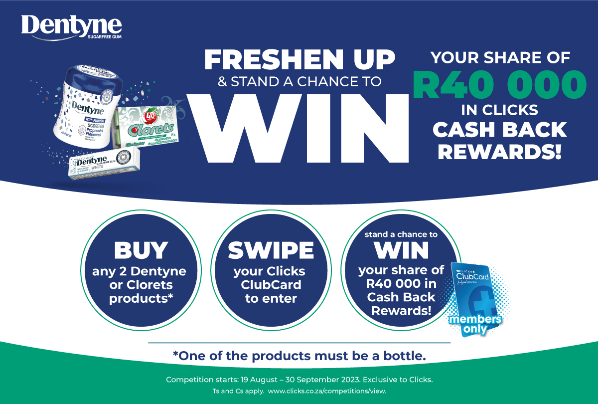Stand a chance to Win 1 of 40 R1000 Cashback Rewards. To enter: you must have bought any 2 Dentyne or Clorets products in a single transaction at a Clicks store in the Republic of South Africa, one of which must be a bottle, and swiped your Clicks ClubCard during the purchase.