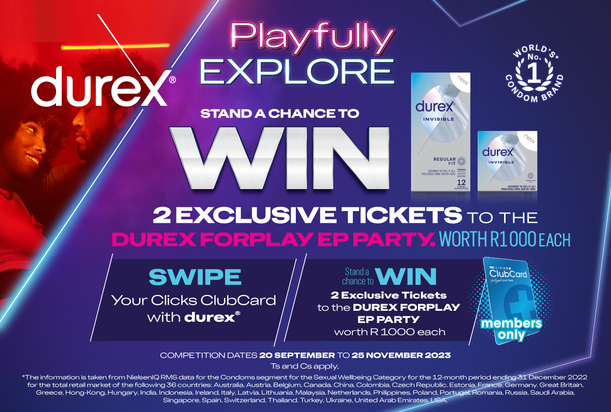 Stand a chance to Win Exclusive tickets to attend the Durex Forplay EP party at a secret location in Gauteng. Each ticket is worth R1000. To enter: you must have purchased any Durex Product in a single transaction at a Clicks store in the Republic of South Africa and swiped your Clicks ClubCard during the purchase.