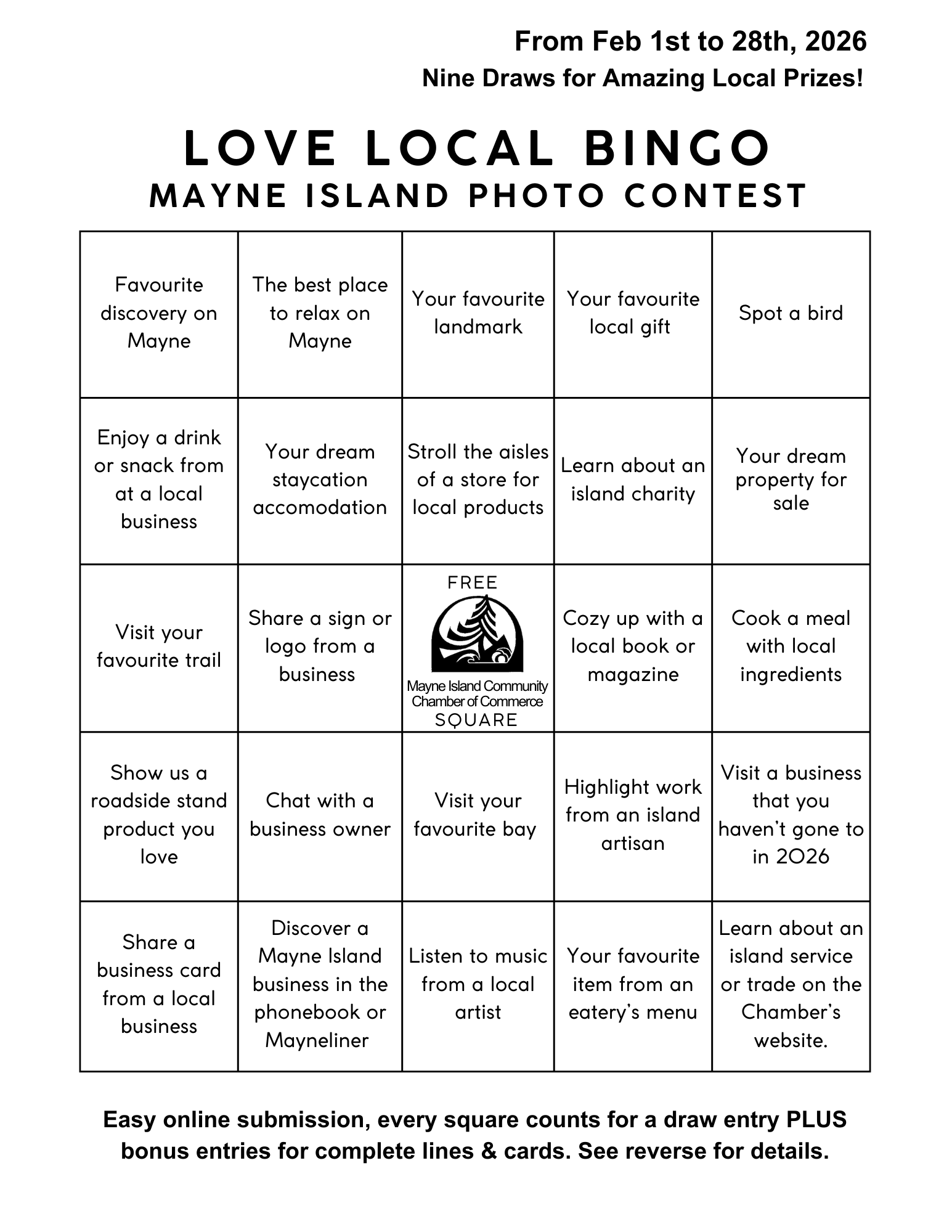 Submit your entries for Love Local Bingo here. Upload your photo(s) and let us know which square(s) you are fulfilling. Each square counts towards an entry. You can get 1 bonus entry for each line (max 5 lines), and 5 bonus entries for a completed card.