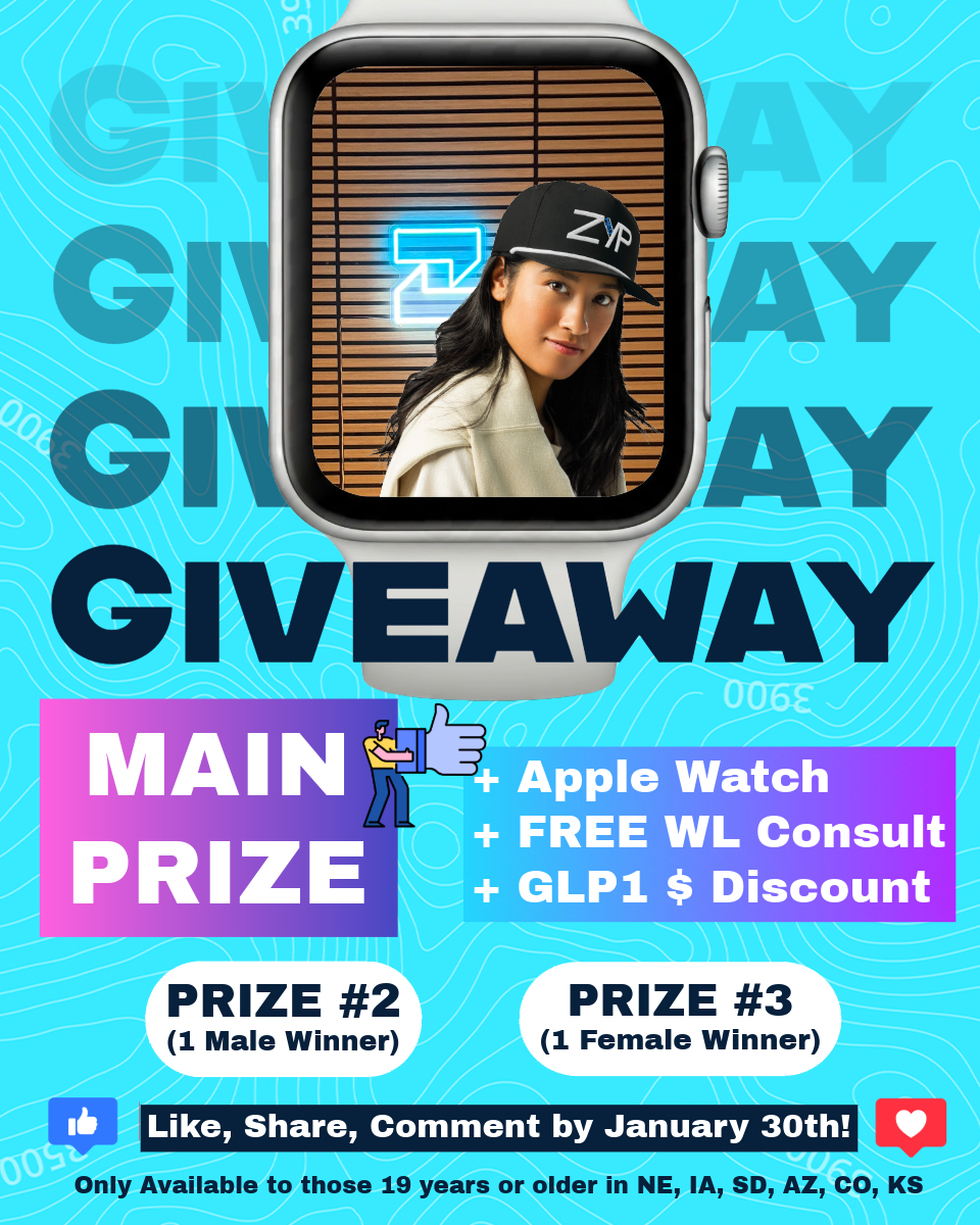 🏆 GRAND PRIZE - Apple Watch + Free Weight loss consult + $50 off one of our GLP1 Start plans-- (or $100 off your next WL plan/refill for existing patients only)