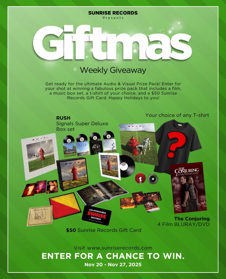This year, Sunrise Records and our partners want to give you a gift. Enter for your chance to win Rush "Signals" super deluxe box set, "The Conjuring" 4 film box set on Blu-ray/DVD, a $50 Sunrise Records gift card and any t-shirt of your choice from our t-shirt wall!