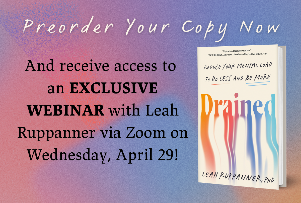 Receive access to an EXCLUSIVE WEBINAR with Leah Ruppanner, PhD via Zoom on Wednesday, April 29 at 8:45PM EST, where Leah will cover topics from her new book, "Drained," as well as address attendees' questions. You may submit your question using the form below. (Can't make the date? We'll send out a recording after.)