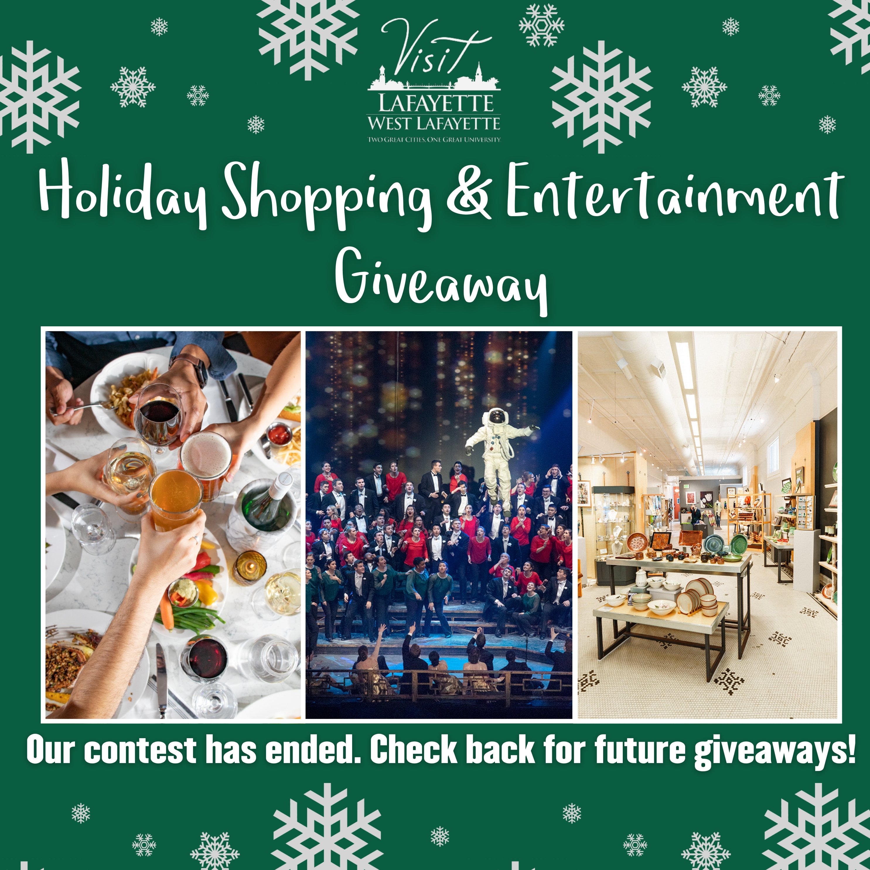 Congrats to winner, Jan from Valparaiso, Indiana! She shares, "How exciting to receive your call this morning letting me know I won the Holiday Shopping and Entertainment Giveaway! You made my day! Having a son who graduated from Purdue we have many fond memories of the Lafayette area. I've always wanted to attend the Christmas show and now it will finally happen. Thank you so much! I look forward to bringing my grandchildren and introducing them to the fun happenings in Lafayette. Boiler up!"
