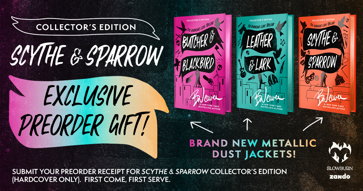 Pre-order SCYTHE & SPARROW COLLECTOR'S EDITION to receive a set of brand new, exclusive metallic dust jackets—one for every collector's edition in the Ruinous Love Trilogy!
