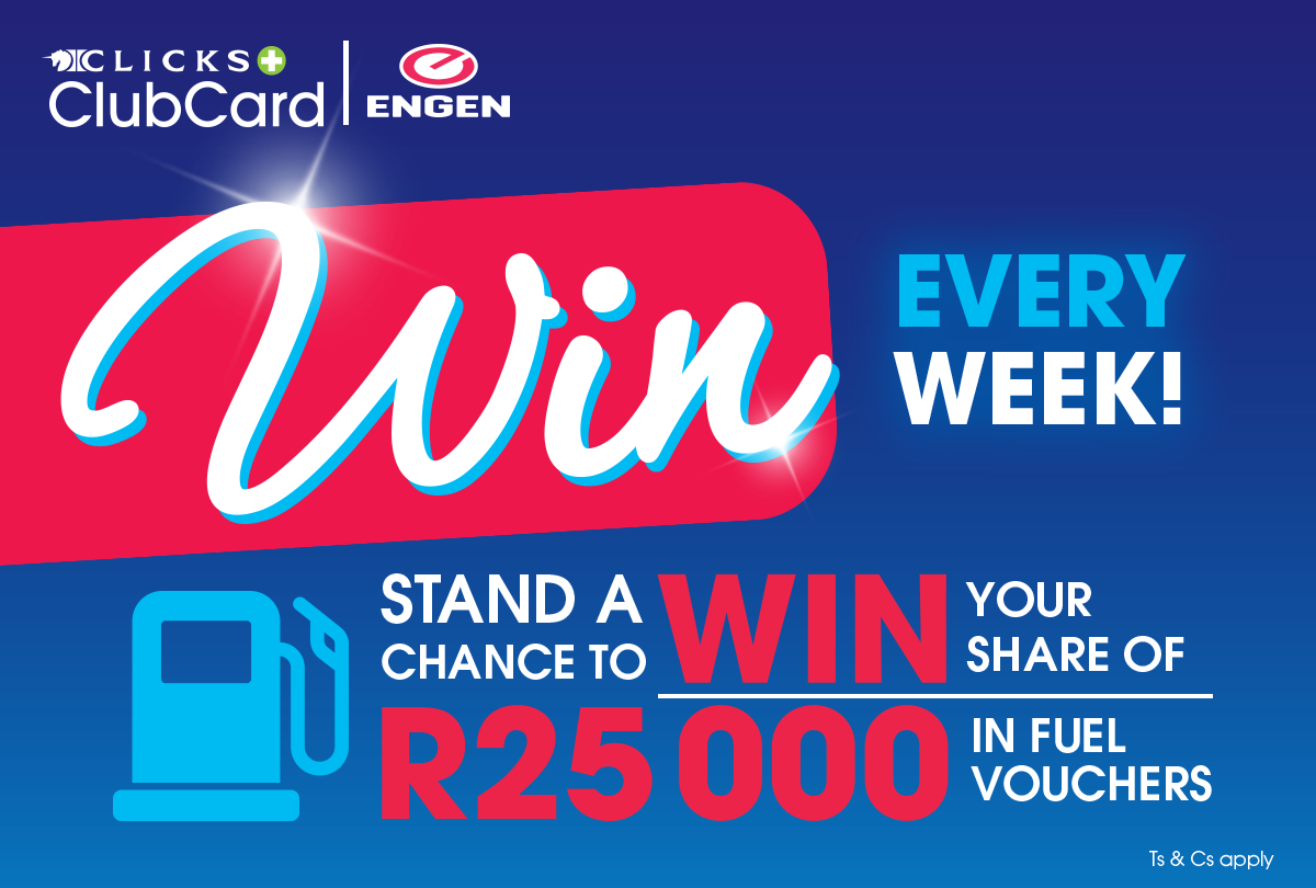 Stand a chance to WIN R5000 Engen 1 app fuel vouchers or a Toyota Cross. To enter, spend R600 or more in fuel at participating Engen service stations, swipe your Clicks ClubCard and complete the entry form on the Clicks WhatsApp channel by messaging “Hi” to +27 72 255 5522, selecting option 6 on the main menu screen.