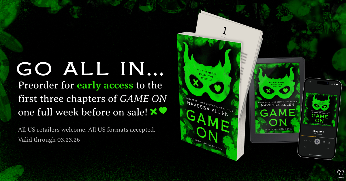Are you ready to play? We are! Preorder the final novel in Navessa Allen’s #1 New York Times bestselling Into Darkness series and get early access to the first three chapters of GAME ON one week before on sale.